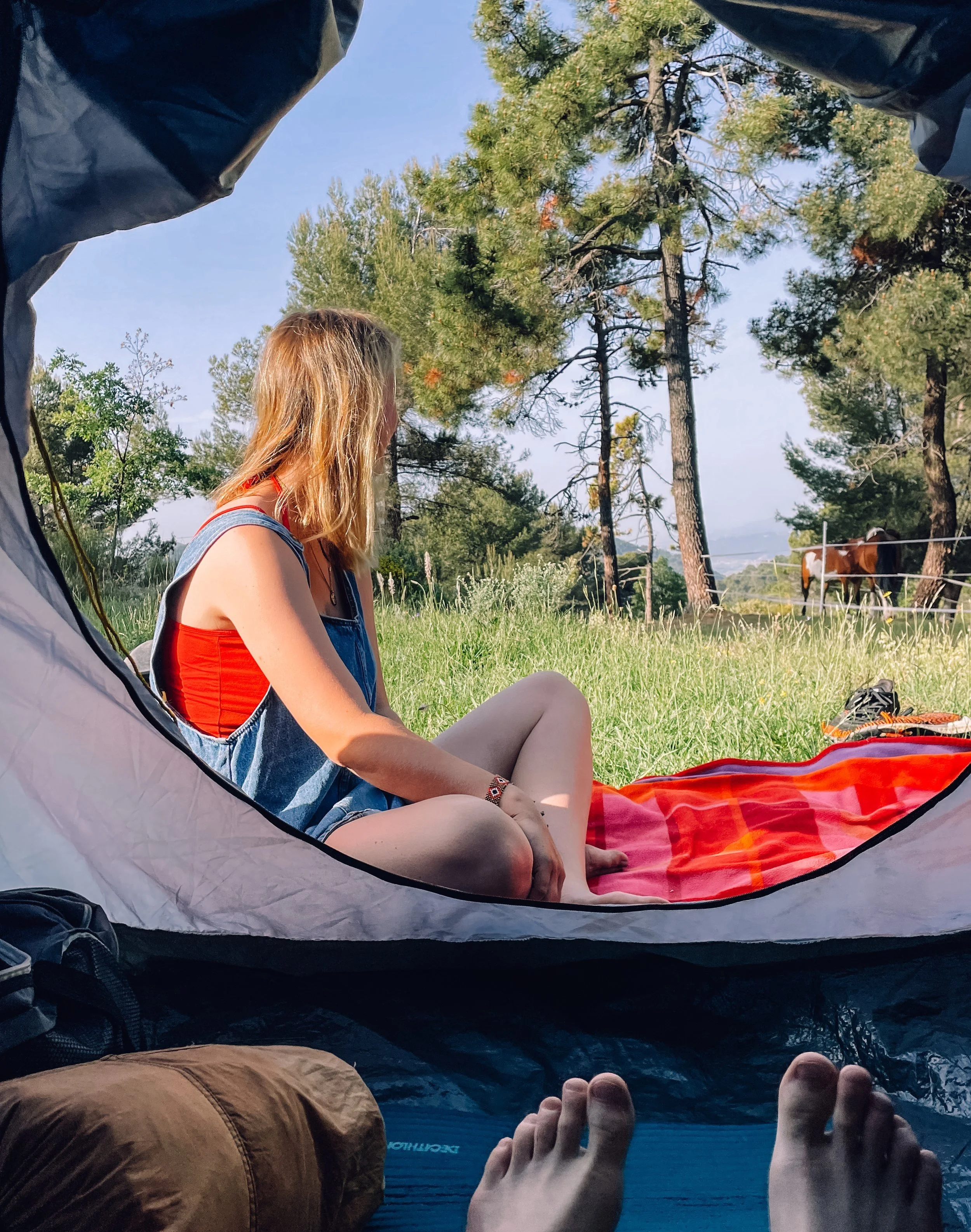 and for the first time, i glimpsed into the open of our wild spot we set up our tent in after tumbling up to our wild camp late last night. the earth was red and our tents dry. evelyne had already left and came back when she told me she was spotting birds in the nearby mediterranean pine forest while i set up the camera to capture the moments. we were on a little hill surrounded by horses. we had a tiny breakfast session, but soon, realizing we were running low on supplies made us head down to the coast of nice through dry canyons. our first stop: a carrefour market by the outskirts of nice, and me, waiting inside the car parked in front of a garage.