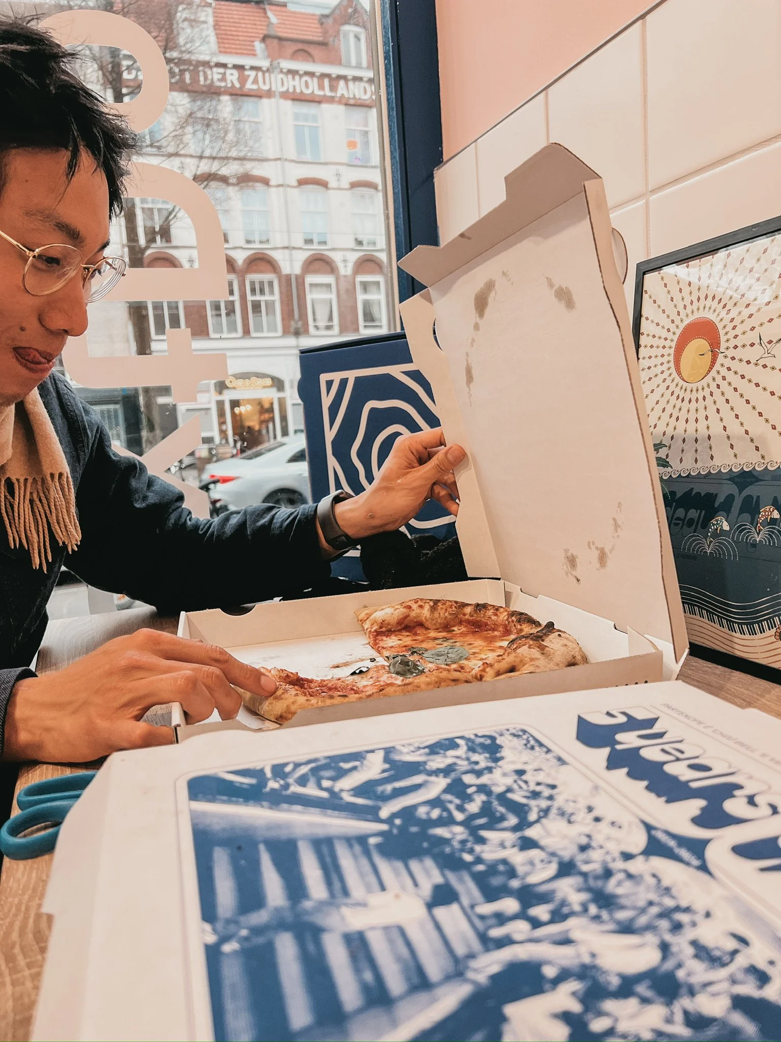 nNea pizza. hands down the best pizza in amsterdam, and perhaps even beyond. in fact it is known as one of the top-ten pizza places in whole europe. they craft unique neapolitan style pizza with jaw dropping fluffy and fiber-rich dough. our pizza vanished in minutes, as did the available seating in the restaurant. if you want to dine in, book in advance. we opted to dine-in at the takeout place, they gave us scissors to cut the pizza, how refreshing!