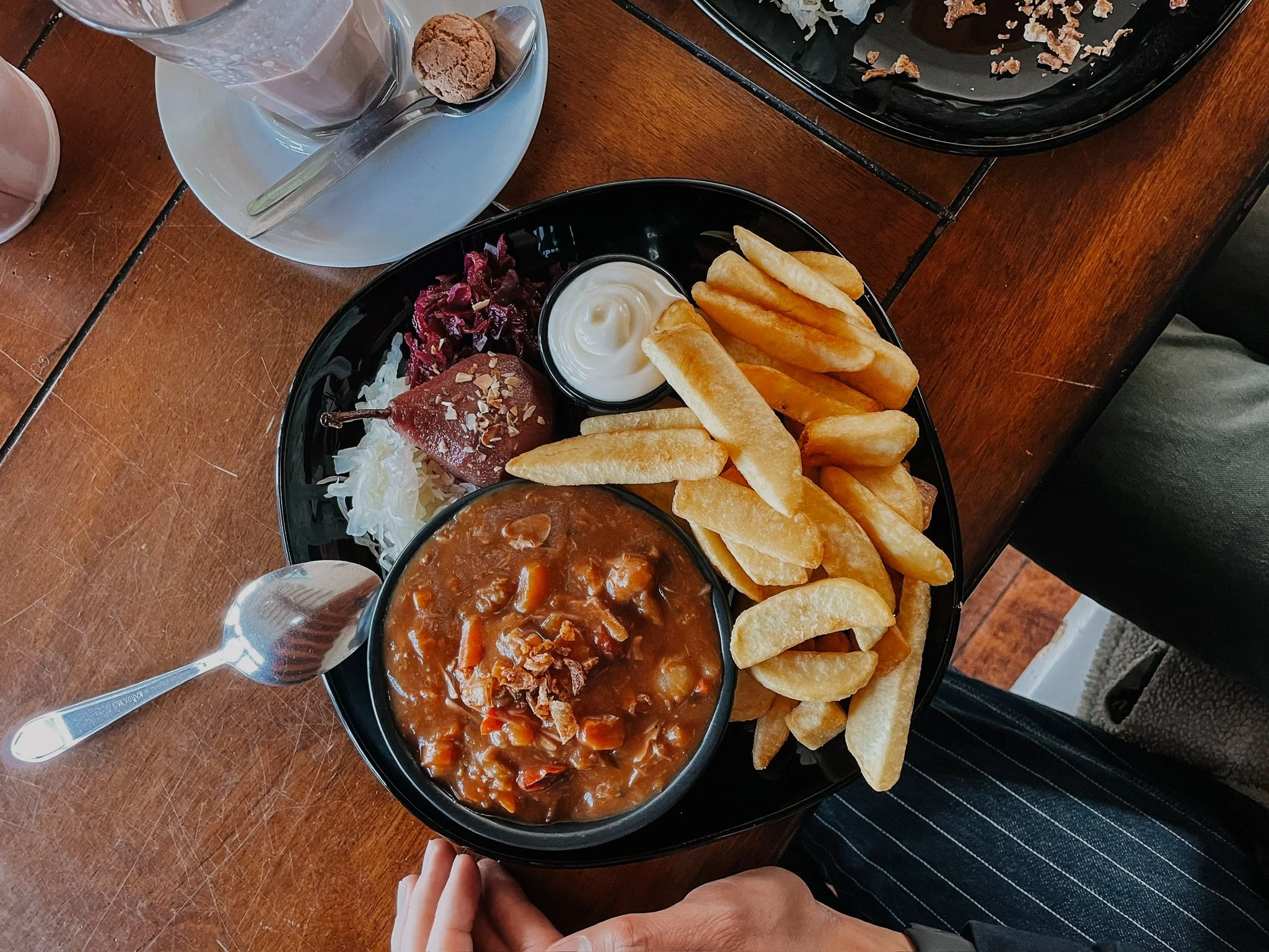 the twiske haven restaurant. a lakeside restaurant surrounded by nature. to get there, you ride your bike across wooden bridges, fresh and light forests and past typical dutch windmills. the restaurant serves authentic traditional dutch food. we had a vegan seasonal jackfruit stew with fries and bread. this is the very first place we would visit again on our next trip to amsterdam!