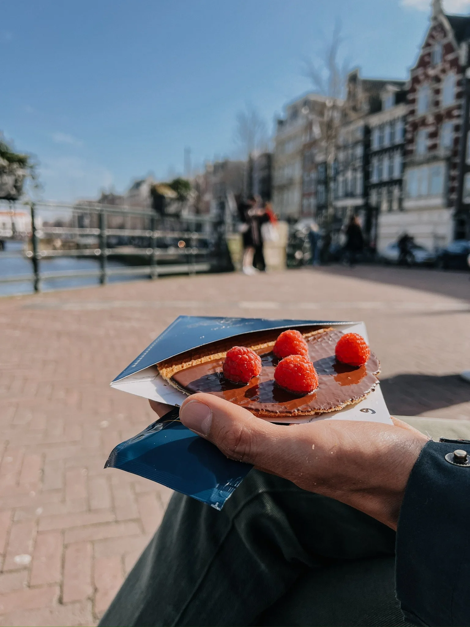 in the country of stroopwafels, it’s your chance to have a bite at warm, freshly made stroopwafels. in case you didn’t know, they are made of two sweet cookies held together by caramel. a good place will let you choose the topping you like!