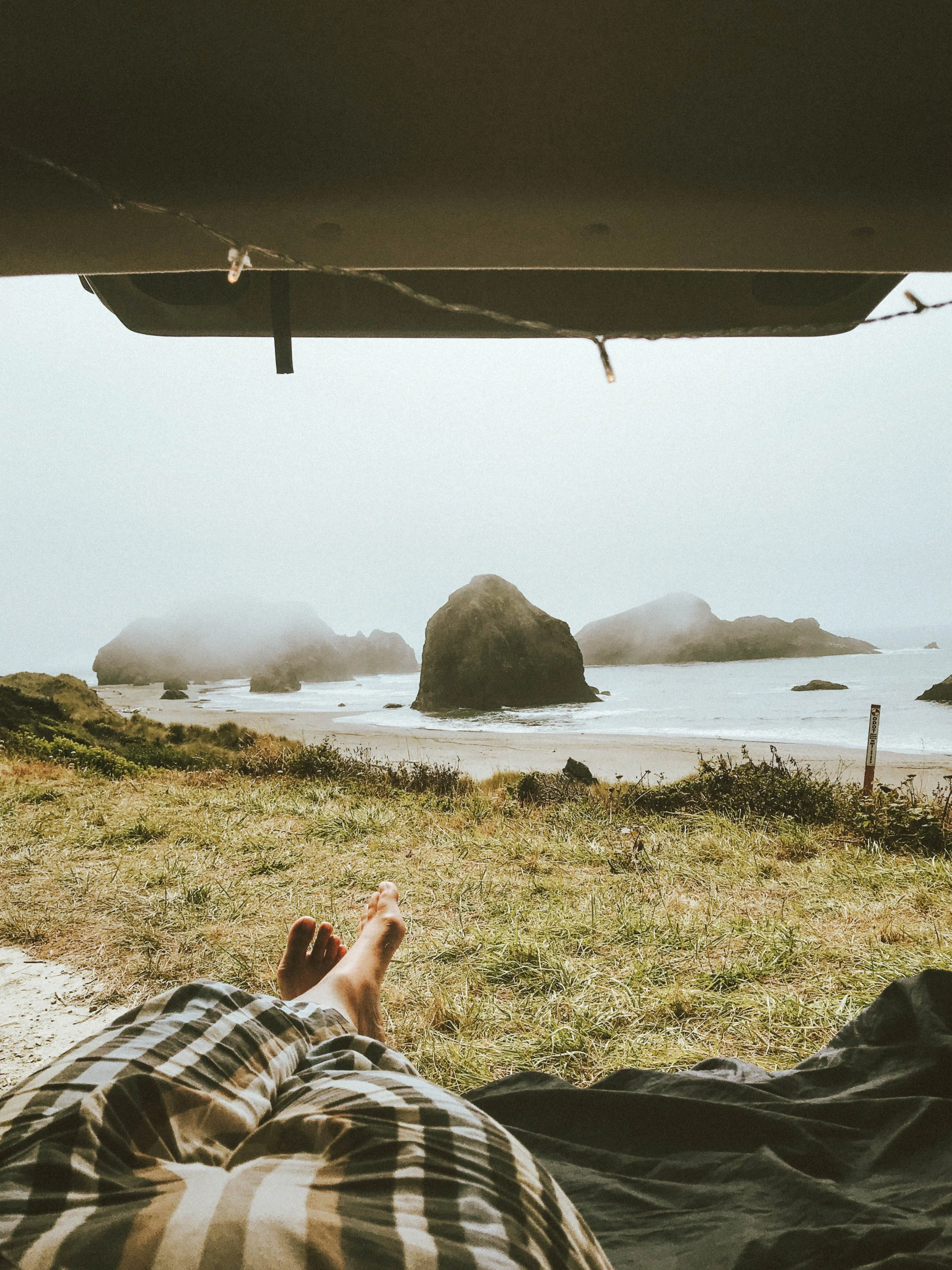 as we were getting closer to the samuel h. boardman scenic corridor, the coast turned more misty and the clouds from the sea swallowed the clear blue sky. we stopped near a beach parking facing a monolith rock sticking out on the beach, decorated our trunk space a little and this was the first time i truly felt like living in a van and how we are going to travel the world. we made music on our cozy masai blanket under dimmed sparks of our fairy lights. the scenic corridor wasn’t far from here.
