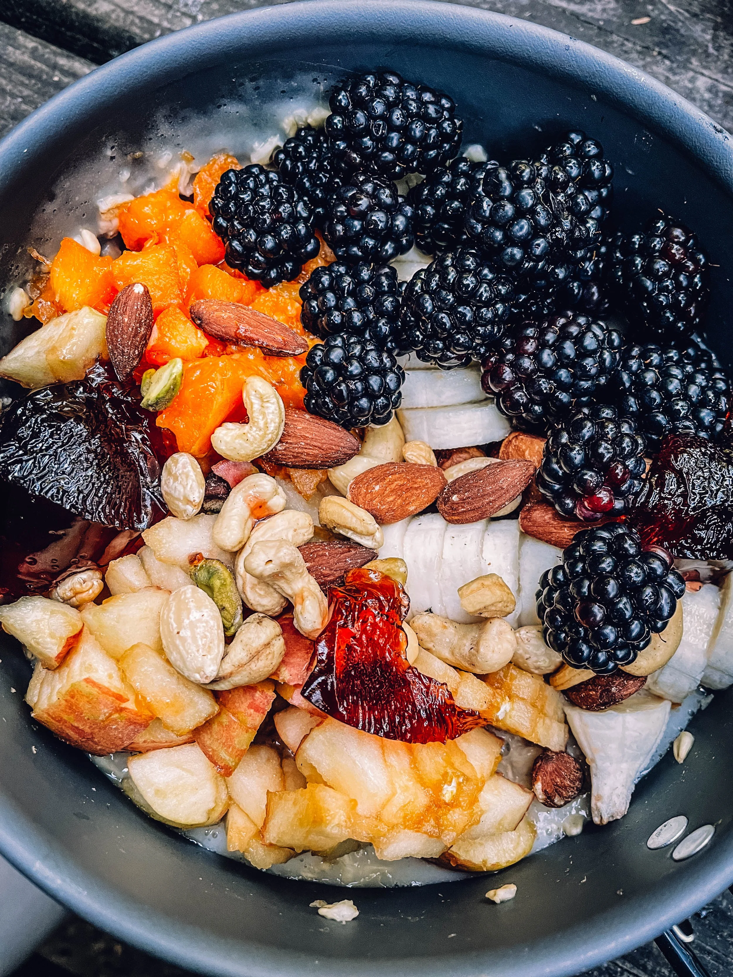 wild blackberry, apricot and apple porridge bowl for breakfast!