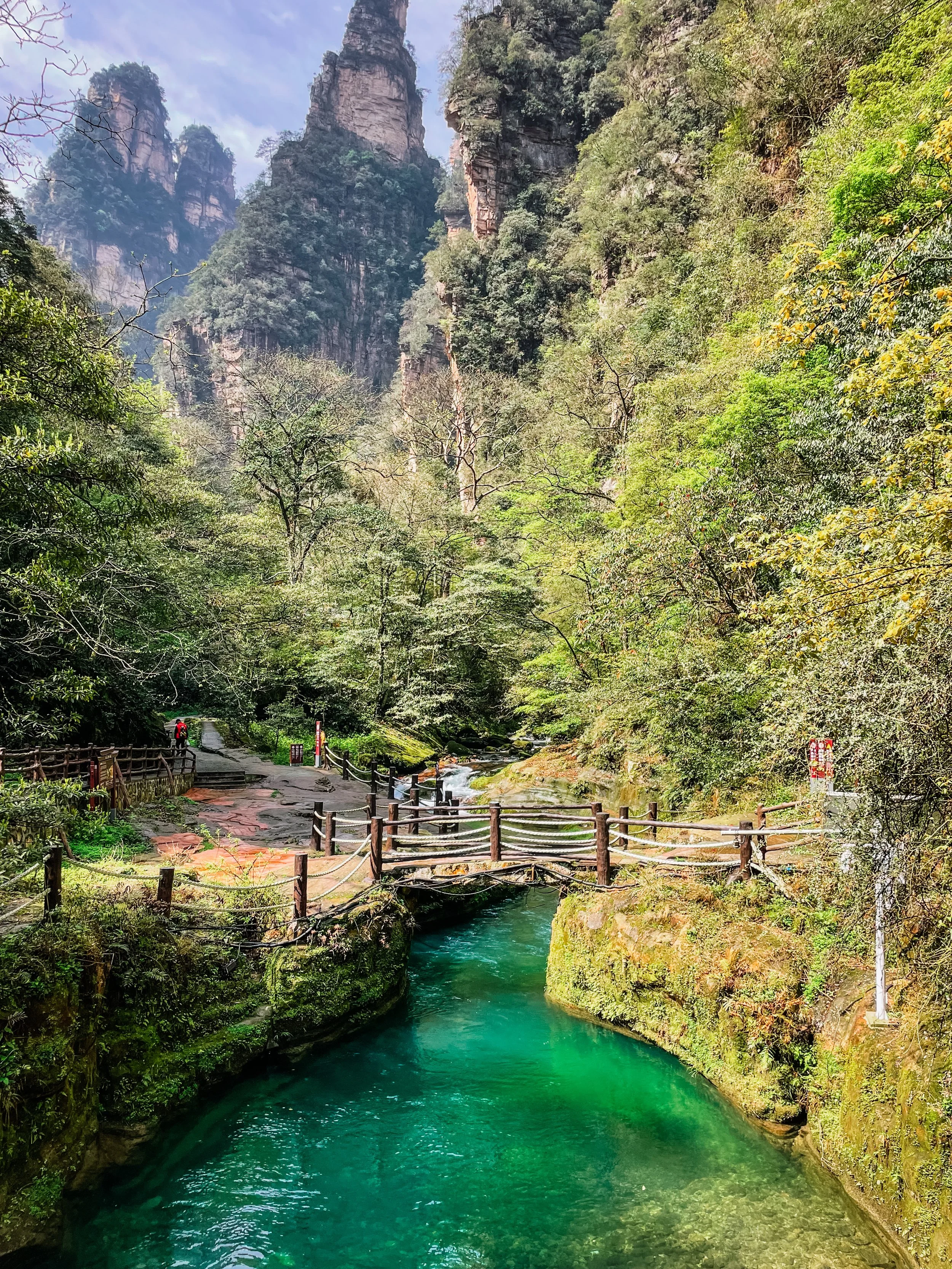 just like you would hike up yuan jia jie on day one, the walk starts at the water winding four gates (水绕四门). but instead of taking the stairs up to yuan jia jie, you keep following the stream. a lot of exciting and entertaining things await you along the walk. although as in all chinese national parks, taking a cold plunge is not allowed, there is a water fountain before you reach oxygen bar square (氧吧广场). the cold spring water promises eternal life, so be sure to not miss out on the opportunity to taste the water!